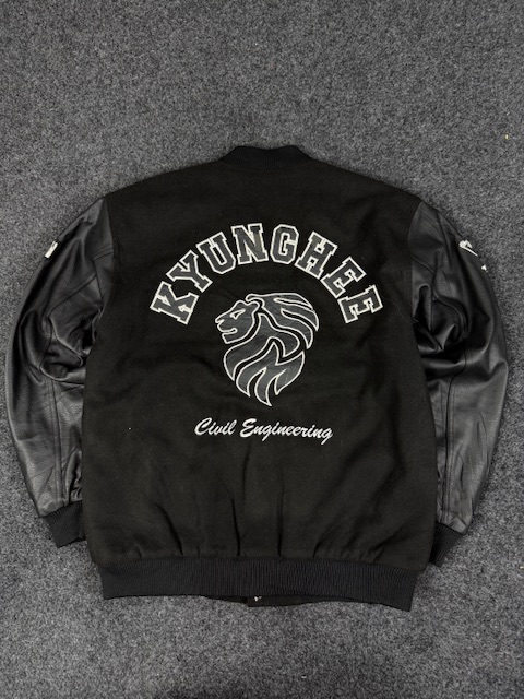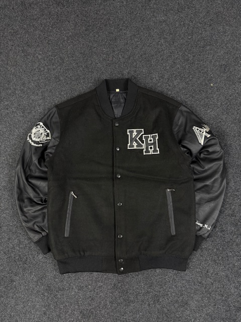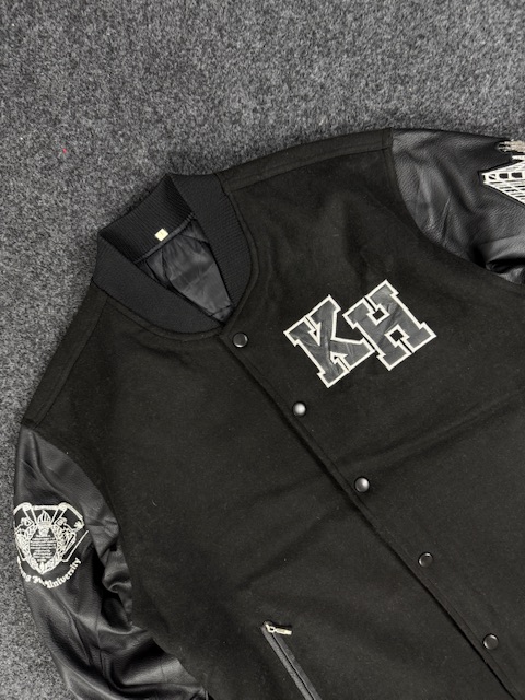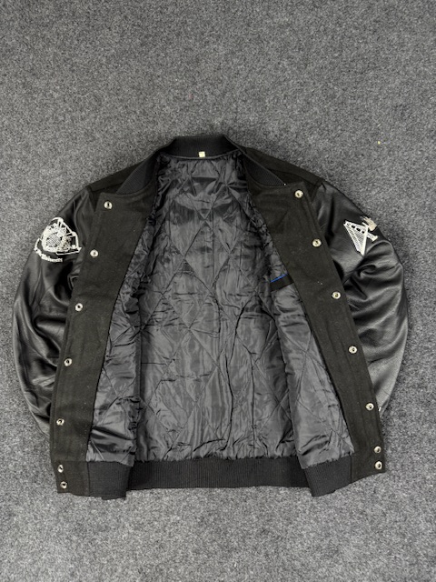 black varsity bomber jacket with faux leather sleeves – LARGE