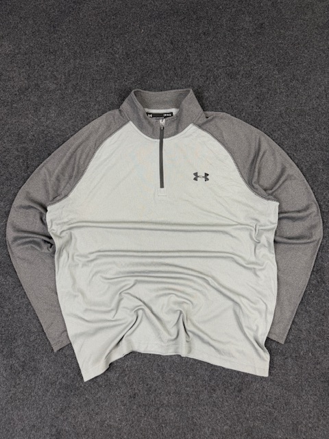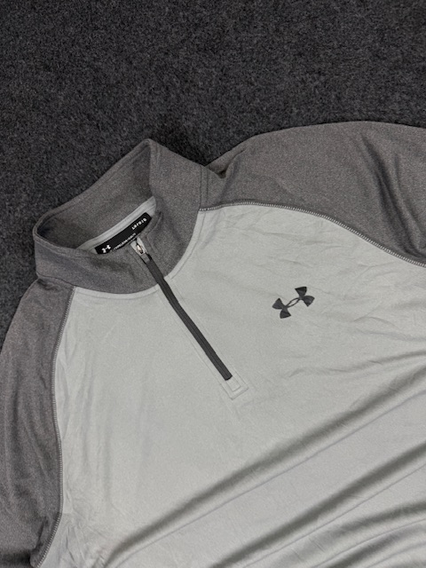 Premium Under Armour performance half-zip training top in a clean grey colorway. Designed with lightweight, breathable fabric for workouts, training, or casual athletic wear. Comfortable loose fit with stretch for easy movement. Perfect for gym sessions, running, or daily sporty styling.