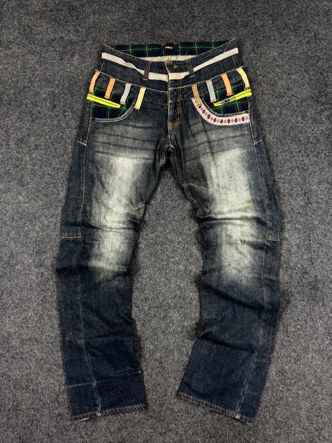 Disphark Vintage Y2K Embellished Cargo-Style Denim Jeans – Dark Blue Wash with Plaid & Neon Accents – (W31 L43)