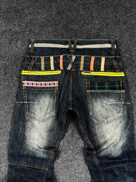 Channel bold early 2000s energy with these eye-catching Disphark jeans, featuring heavy custom patchwork details, vibrant plaid inserts, neon yellow zippered pockets, multicolored embroidered trim, and contrast stitching for maximum streetwear impact. Made from premium rigid denim with a dark blue wash, subtle whiskering, and a relaxed straight-leg fit through the thigh that tapers slightly at the hem. Highlights include oversized belt loops with plaid fabric overlays, unique front and back pocket designs with zip accents and ethnic-inspired borders, button fly, and a mid-low rise for comfortable, statement-making wear. Perfect for Y2K revival outfits, urban fashion, festival looks, or anyone wanting standout denim that mixes grunge, punk, and luxury patchwork vibes.