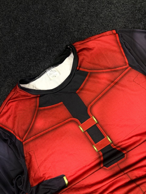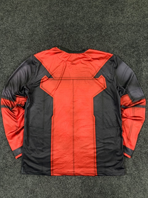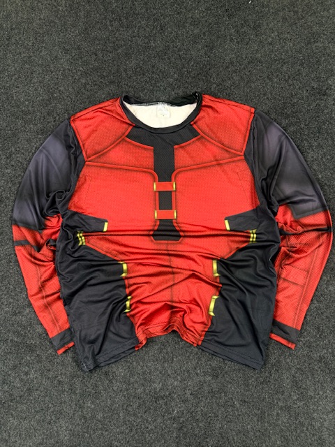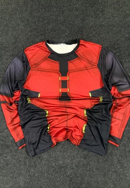 High-stretch performance compression T-shirt featuring a bold superhero-inspired red & black design. Made to fit snug on the body, this piece offers excellent stretch, breathability, and muscle support—ideal for gym training, workouts, cosplay fits, or statement streetwear looks.